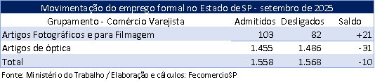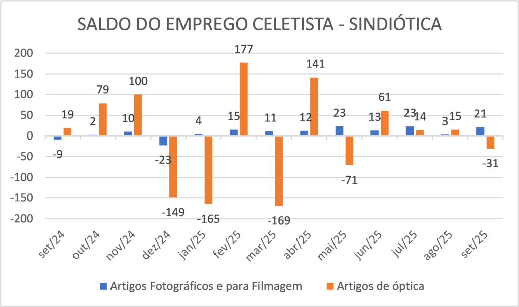 De janeiro a setembro, o saldo acumulado é de +88 postos de trabalho formais, com estoque total de 27.223 vínculos ativos no setor óptico e fotográfico representado pelo SindiópticaSP.