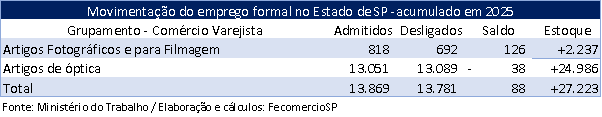 Os dados são provenientes do Novo Caged, que compila mensalmente as informações sobre admissões e desligamentos com carteira assinada em todo o país. O SindiópticaSP e parceria com a FecomercioSP realiza o monitoramento contínuo desses indicadores para subsidiar políticas de fortalecimento do varejo óptico e contribuir para o planejamento estratégico das empresas do setor.
